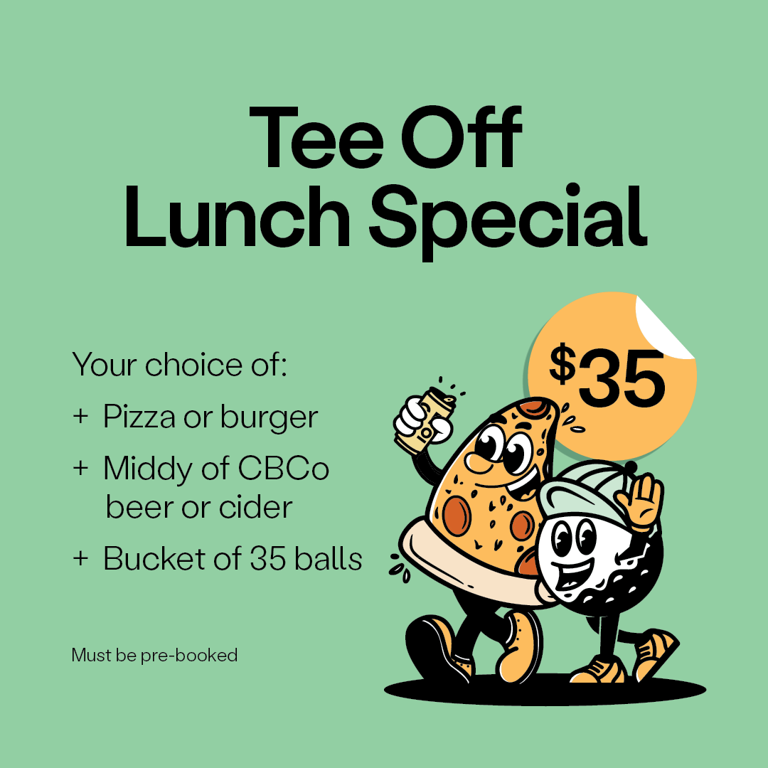 Book NowEnjoy your choice of pizza or burger, a middy of CBCo beer or cider, and a bucket of balls for the driving range. Must be pre-booked, no walk-ins.